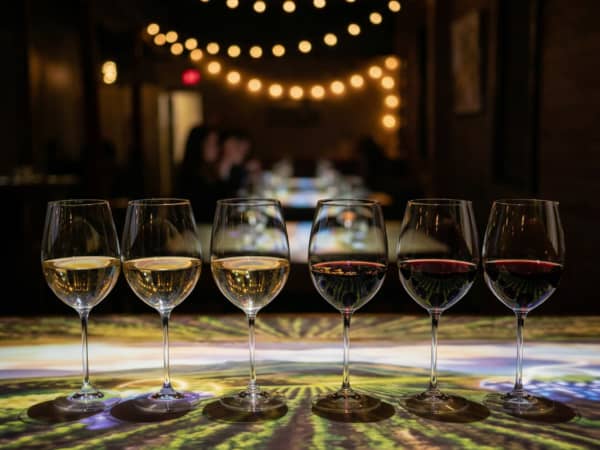 The experience features multiple wine pairings with visual stories, though the exact number varies by session. Each pour comes with its own immersive projection sequence.